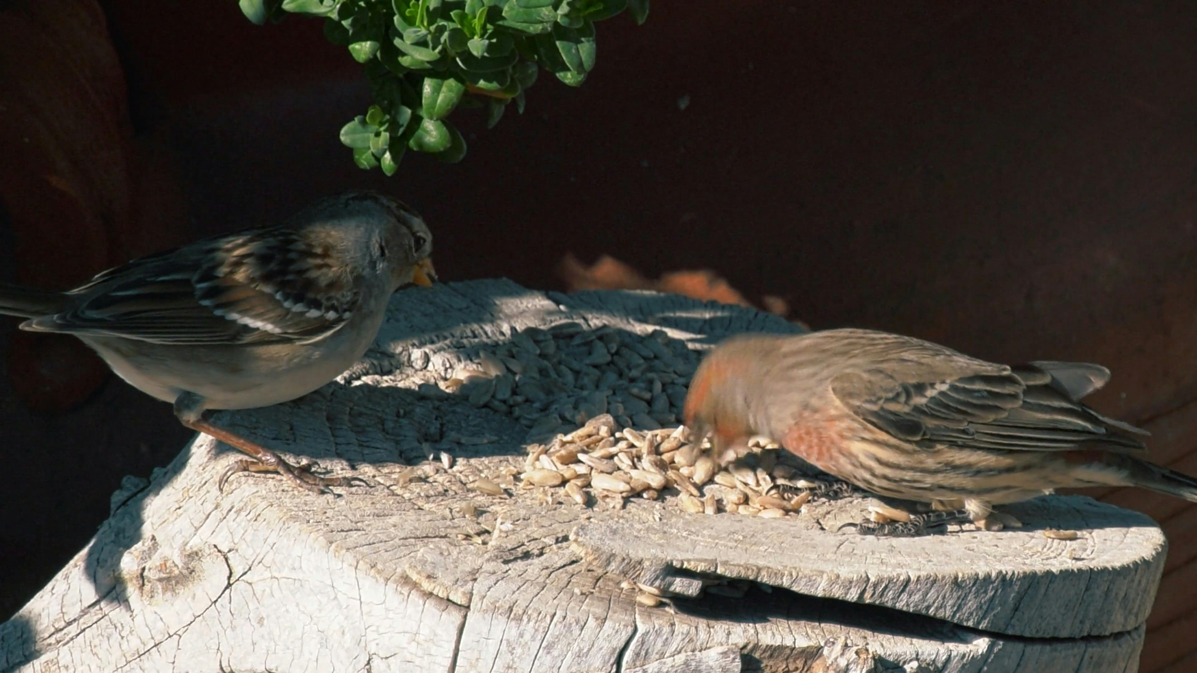 Two House Finches Eating Sunflower Seeds from a Tree Stump Free Stock